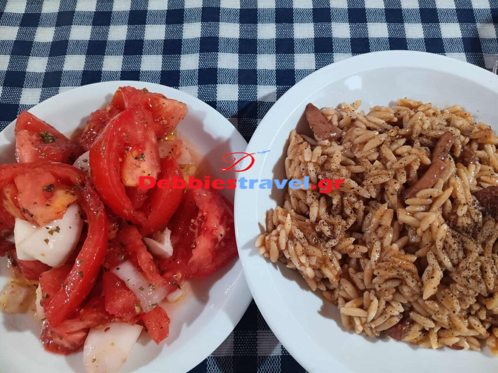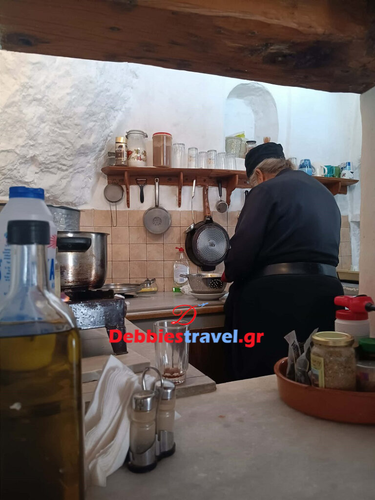 Ο πατέρας Σπυρίδωνας στο κουζινάκι, τηγάνιζε πατάτες οι οποίες όπως αποδείχθηκε ήταν εξαιρετικές! Μαγείρεψε στο καζάνι κριθαράκι με σουπιές, να γλύφεις τα δάκτυλά σου, και ντοματοσαλάτα με κρεμμυδάκι με μια ντομάτα κατακόκκινη που μοσχοβολούσε μποστάνι!