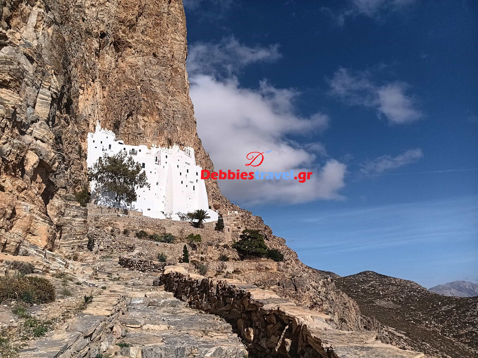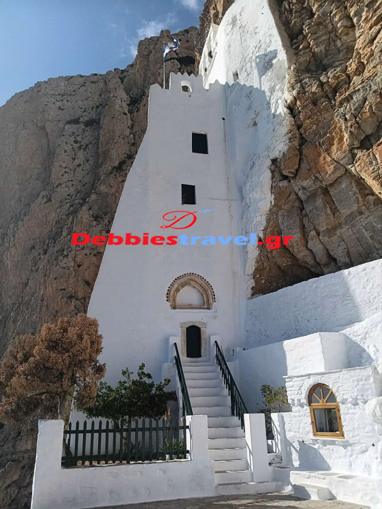 Τριακόσια μέτρα από τη θάλασσα, τριακόσια σκαλοπάτια για να φτάσει κανείς στη μονή της Παναγίας Χοζοβιώτισσας, που είναι γαντζωμένη στα βράχια και ατενίζει το Αιγαίο!