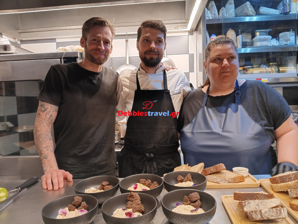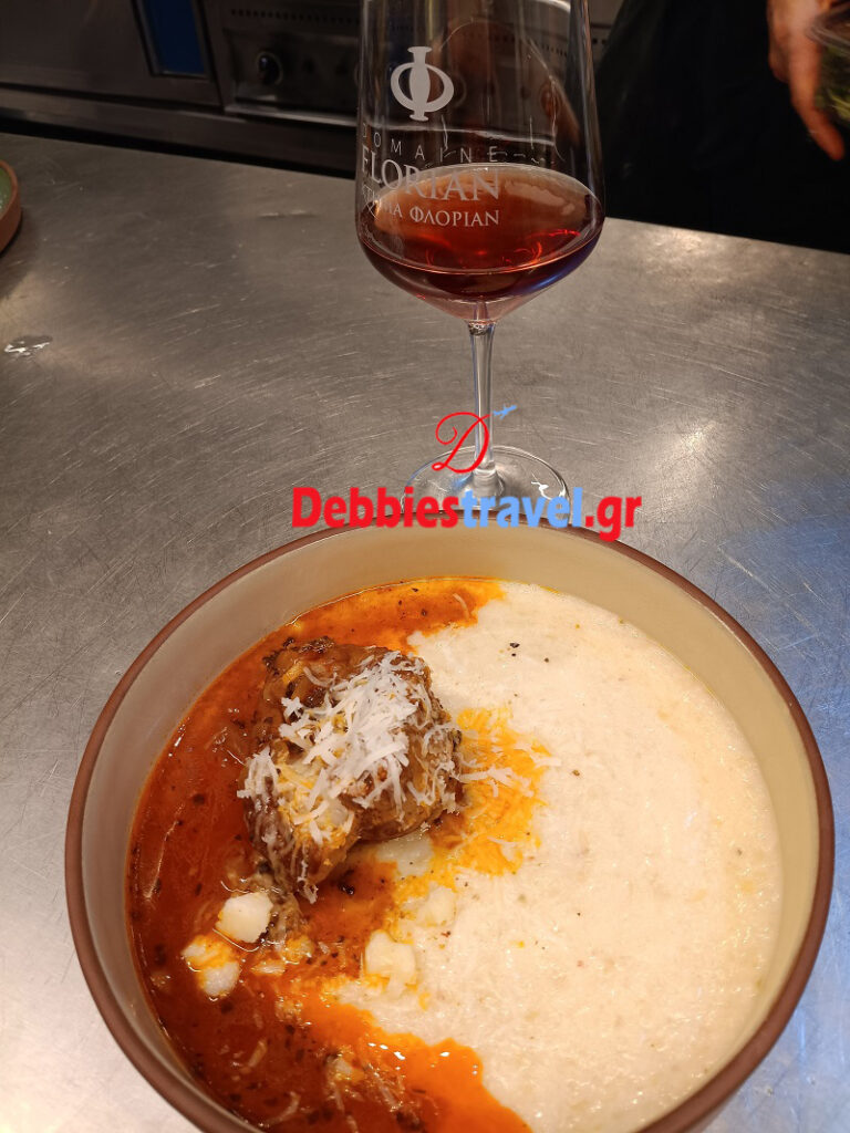 Σαλάτα με άγρια χόρτα, κρέμα από παντζάρια, φιστίκια Αιγίνης και γαλοτύρι, ενώ στη συνέχεια περάσαμε στα κυρίως.