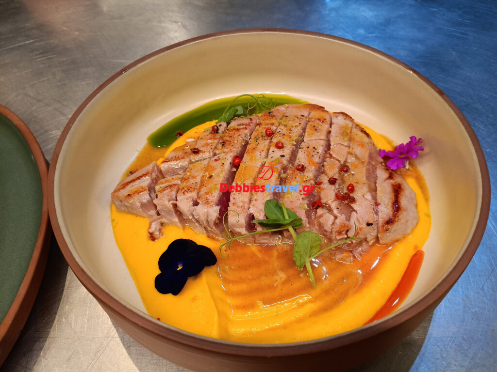 Μια ταλιάτα τόνου με σάλτσα πορτοκάλι και τζίντζερ και πουρέ κολοκύθας.