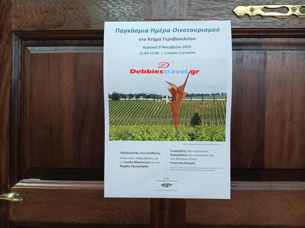 Στην περίπτωση του Κτήματος Γεροβασιλείου, περιλαμβάνεται μια σειρά δράσεων για την αυριανή μέρα, με ελεύθερη είσοδο, από τις 11 το πρωί έως τις 17.00: ξεναγήσεις στον αμπελώνα, περιήγηση στο οινοποιείο και στο Mουσείο Oίνου και οινογευσία επιλεγμένων κρασιών του Κτήματος.