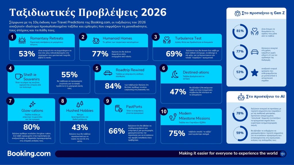 Σύμφωνα με την 10η έκδοση των Travel Predictions της Booking.com, οι δέκα βασικές τάσεις που θα διαμορφώσουν το ταξιδιωτικό τοπίο το 2026, είναι οι εξής: