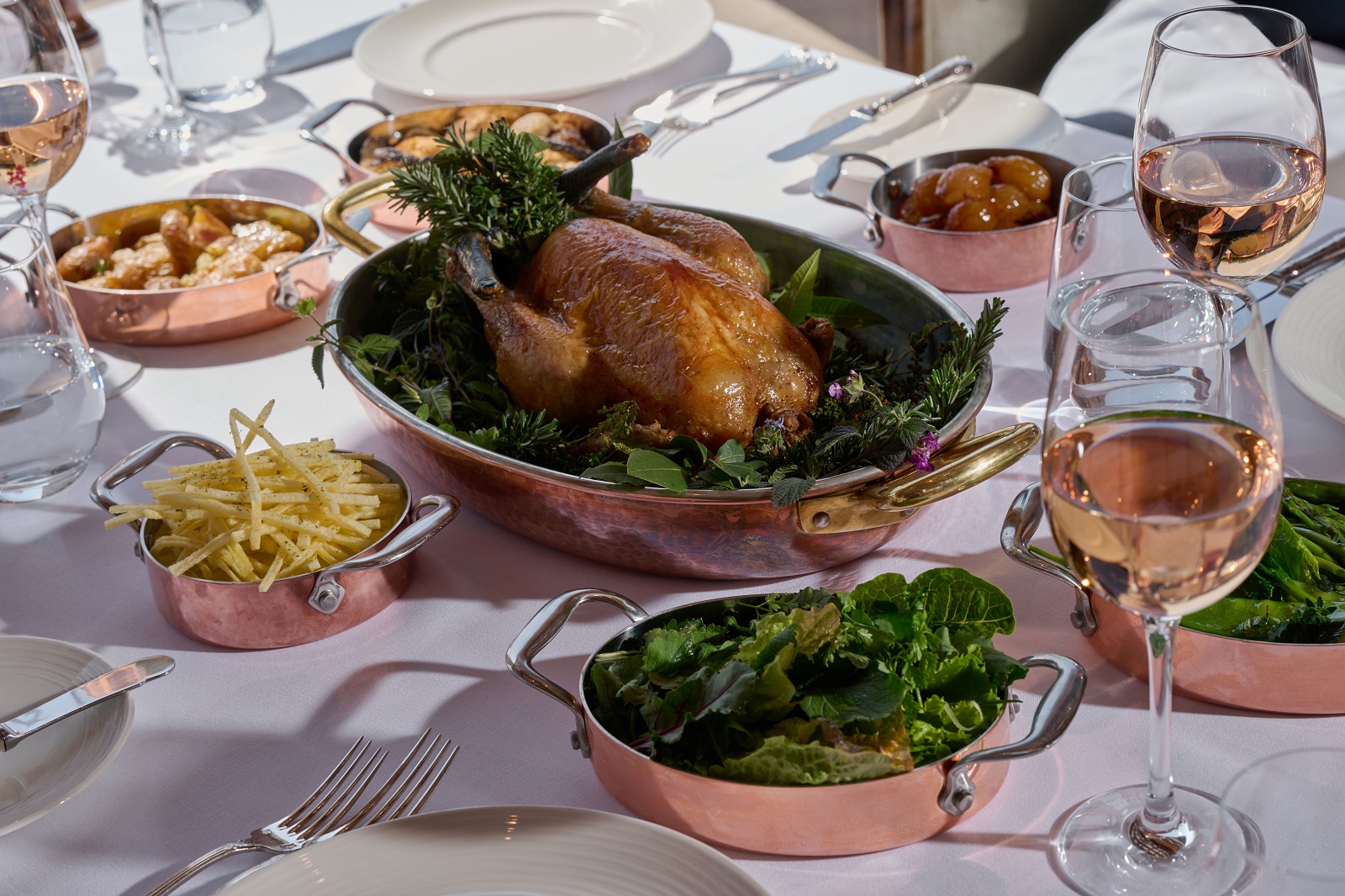 Συγκεκριμένα, στο GB Roof Garden η poularde de Bresse σερβίρεται ψημένη ολόκληρη, με πλούσια σάλτσα από τους χυμούς του ψητού και φρεσκοκομμένη εποχική τρούφα.